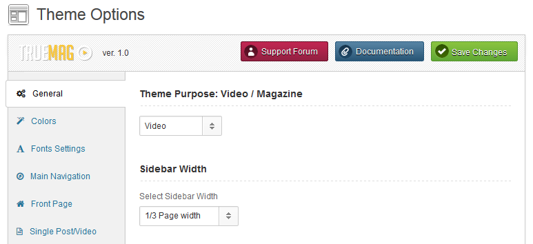 There are settings for General, Colors, Fonts, Main Navigation, Front Page, Single Post/Video, Single Page, Blog, Category, Headline Section, Search, 404, Advertising, Social Account, Social Sharing and Theme Update. It is quite straight-forward to learn the use of these sections
