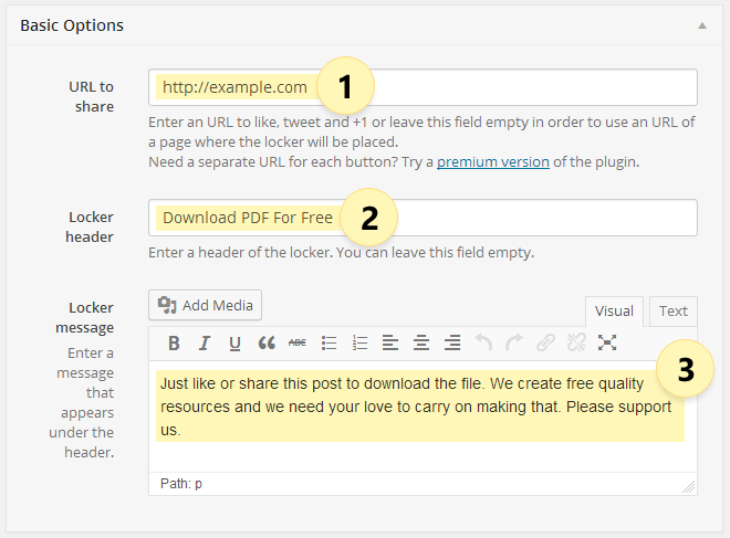 URL to share: Enter the URL that you want your visitors to like, tweet or +1. Or, you can leave this field empty to use the URL of the page where the locker is located. Need a separate URL for each button, try a premium version of the plugin.