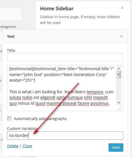 Additional step: go to Appearance > Widget, in Home Sidebar, open the first Text widget and enter no-border in Custom Variation field. This will change the style of Testimonial widget in home page.
