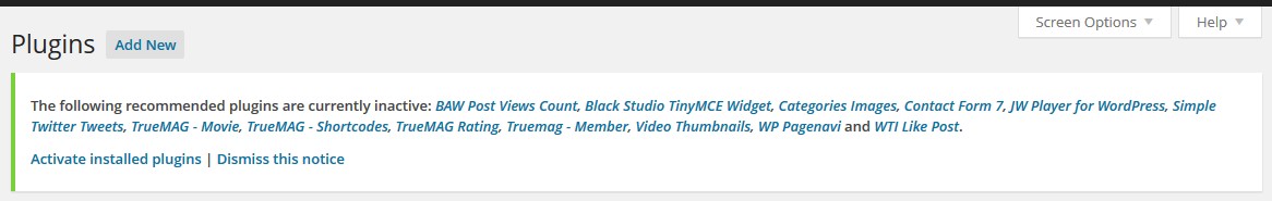 Step 6. Install optional plugins if needed. The four included plugins are optional, but we recommend to install at least TrueMag Shortcodes and TrueMag Movie plugin to have full features. Navigate to Plugins > Add New to install and activate plugins. Besides, we recommend using these extra plugins (free). All has been tested and used on our demo page
