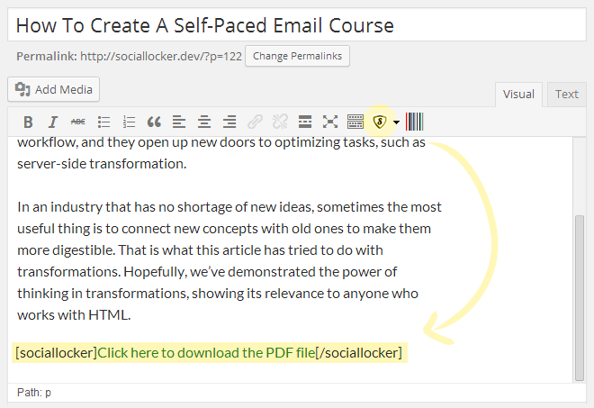 Open the post editor for the post where you want to put the locker. Then wrap the content you want to lock within the locker shortcode. For instance: [sociallocker] Locked Content Goes Here [/sociallocker]: