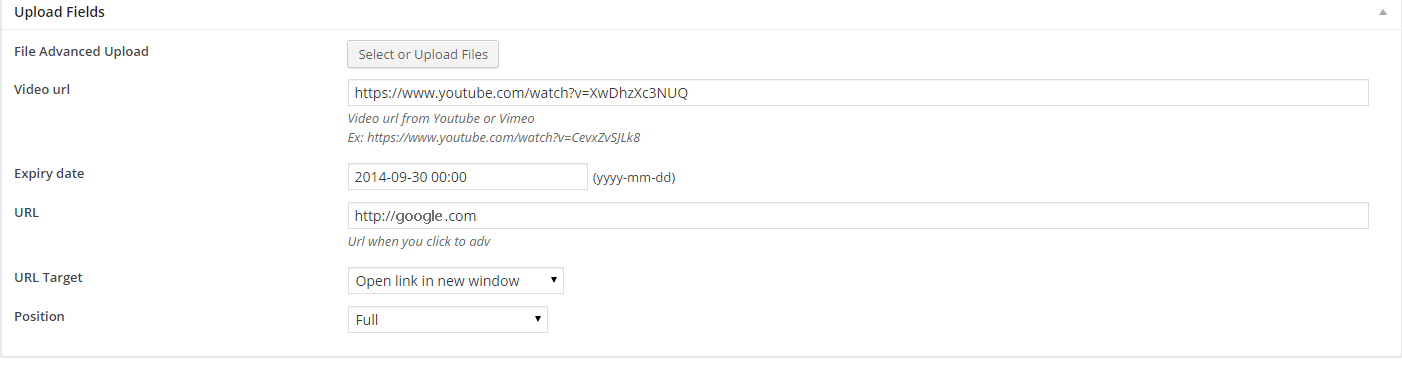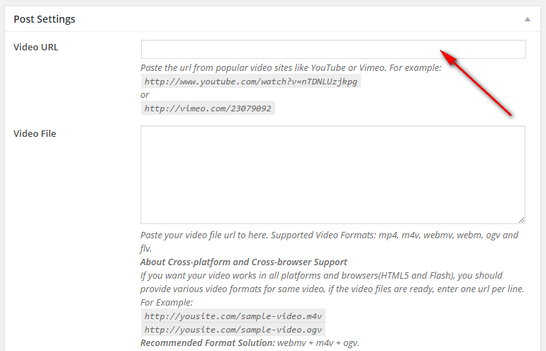For Example: When adding a post, enter YouTube Video URL to this field: Video URL of Post Settings