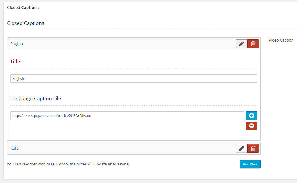 To use this feature, go to a video post and find the "Closed Captions" setting box. Upload sub-title files somewhere and then paste the link to Video Caption fields. Each field is for a language