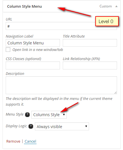 Column Style MUST HAVE Level 0, Level 1 (also called Heading of Column), and Level 2 menu items.
