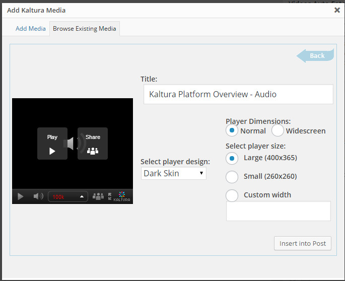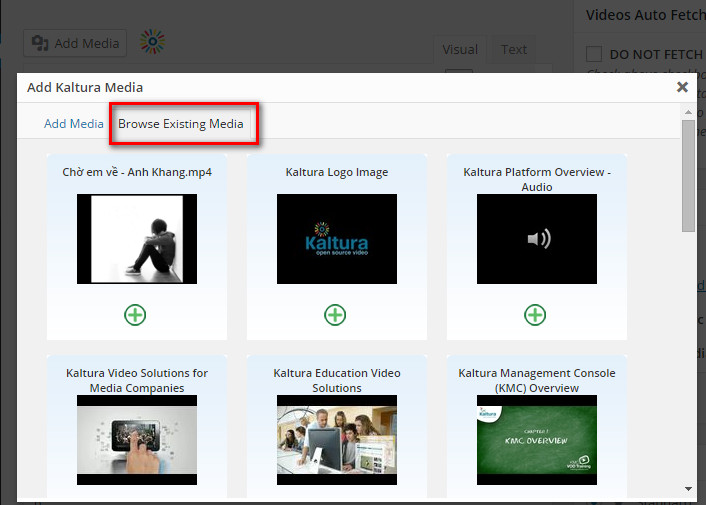 When the window Add Kaltura Media is appeared, choose tab Browse Existing Media to see the list of medias in your account
