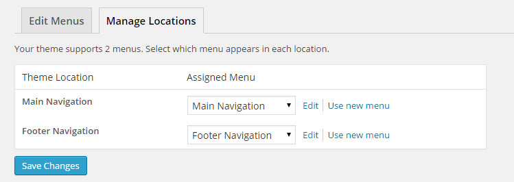 In the Manage Locations area, under Main Navigation, select menu for Primary Menu, Secondary Menu or Footer Menu. Click Save