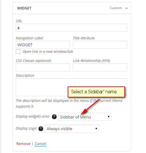 After widgets are set up, go back Menus and click on a Level 1 menu item. Choose sidebar in Display widgets area.