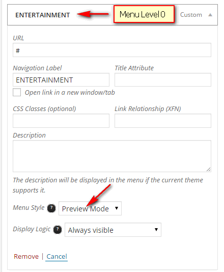In this mode, menu only has 2 levels (Level 0 and Level 1). Level 1 MUST BE one of the following type: Categories, Tags, Posts, Pages and WooCommerce/JigoShop Product Categories