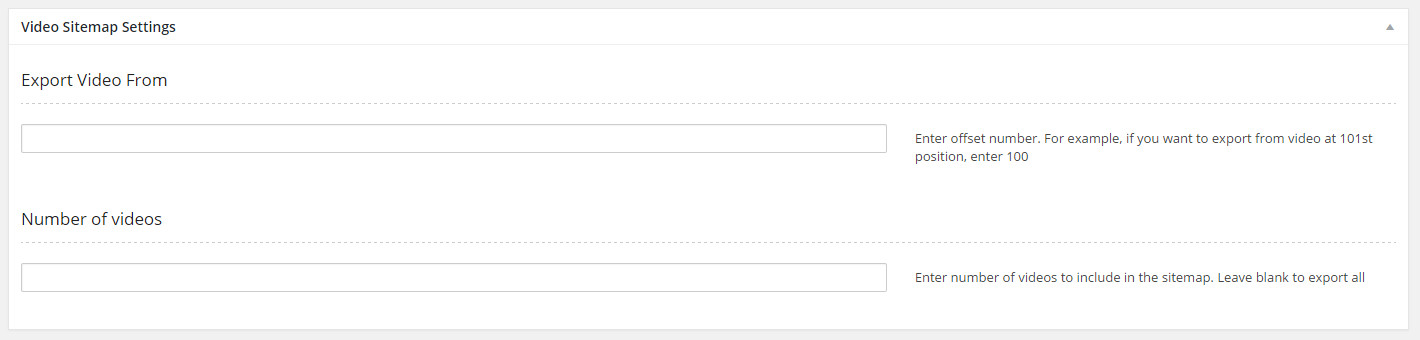 If you have a lot of videos, the full sitemap may be two long. To prevent this, edit the Video - Sitemap page template and scroll to Video Sitemap Settings box. Set the value for Export Video From and Number of Videos to truncate the full sitemap into smaller files.